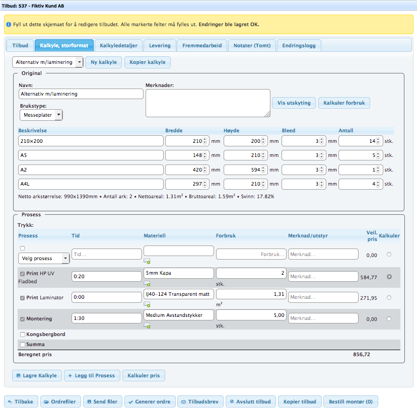 Den prosessen som skal være utgangspunktet for beregning av format og utskyting må aktivt velges for dette ved å velge denne prosessen i kolonnen «Kalkuler». Når kalkylen lagres beregnes formater, arkstørrelser, omfang og pris. Forbruk fylles ut automatisk på den valgte prosessen. Estimert tid fylles ut på alle prosessene basert på tid som er oppgitt på prosessen. For å gjøre en kjapp kalkulering av pris uten kjøre hele lagreprosessen, klikk «Kalkuler pris».