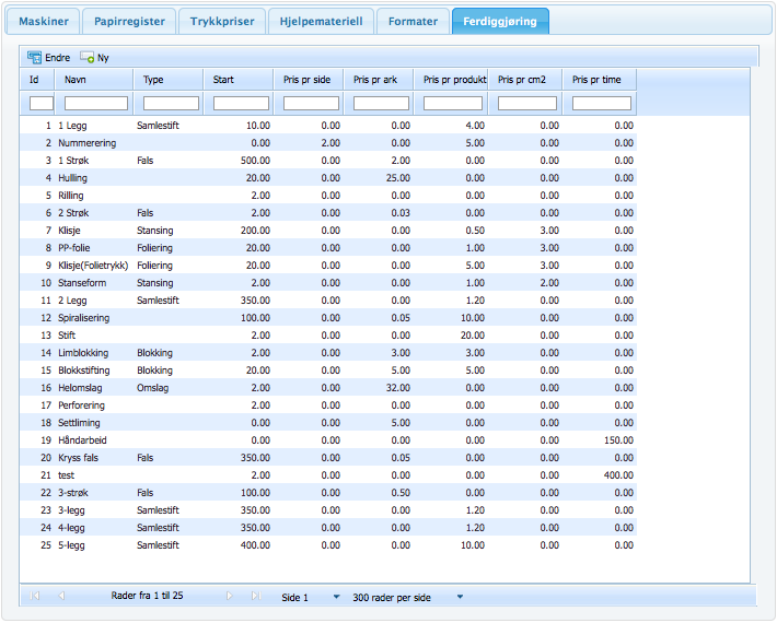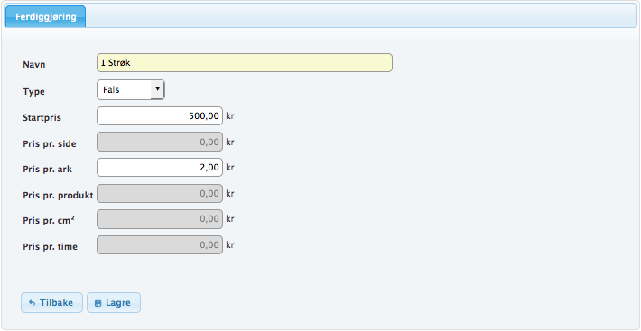Ved redigering av en ferdiggjøring vil ulike prisfelt være aktiv/inaktiv basert på type ferdiggjøring som velges. Dette gjelder de typene som kan ha flere alternativer, som er fals, samlestift, stansing, foliering, blokking og omslag. For disse er det forhåndsdefinert hvordan pris skal beregnes. F.eks. prises «blokking» med en startpris i tillegg til per ark og per produkt. Dette for at prisen skal øke dersom blokka er tykkere (flere ark). For samlestift kan det ved å opprette flere ferdiggjøringer av denn etypen, opprettes ulike priser for X antall legg, så mange det er behov for. Valgene vil dukke opp i dropplisten under «samlestift» i kalkylen.