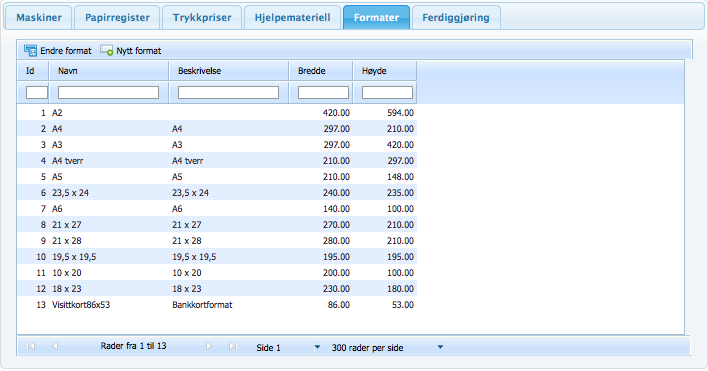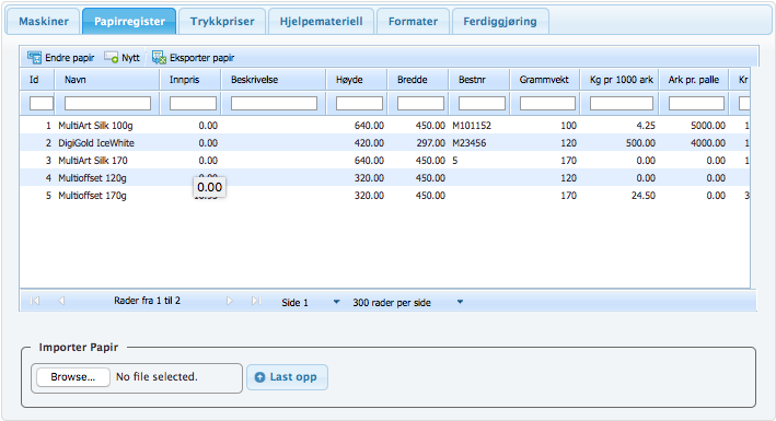 Alt papir som skal brukes av produksjonsordren må opprettes eller importeres her. Her legges kun alle råformatene inn. Systemet beregner selv hvordan papir må kuttes for å få plass i maskin.