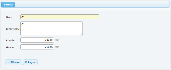 For å slippe å skrive inn millimetermål på alle formater, er det mulig å definere et sett med mye brukte formater.