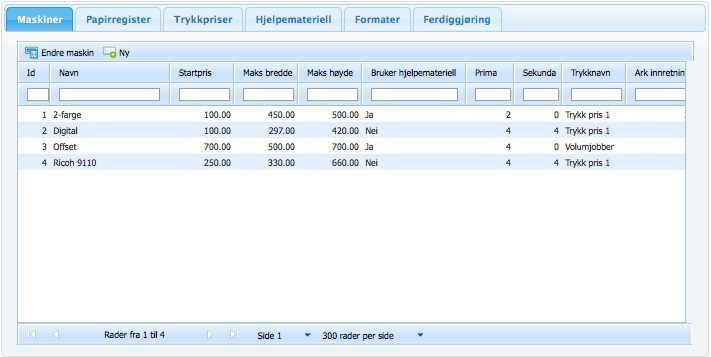 Maskiner | Papirregister | Trykkpriser | Hjelpemateriell | Formater | Ferdiggjøring