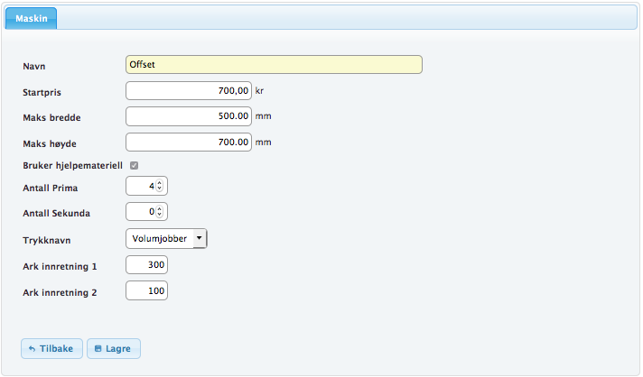 Per i dag er det kun trykkplater som tas med i beregningen. Prisen er oppgitt pr. stykk, og vil da beregnes per farge som angis i kalkylen. Klikk «Nytt hjelpemateriell» om trykkplatepris ikke allerede er definert eller