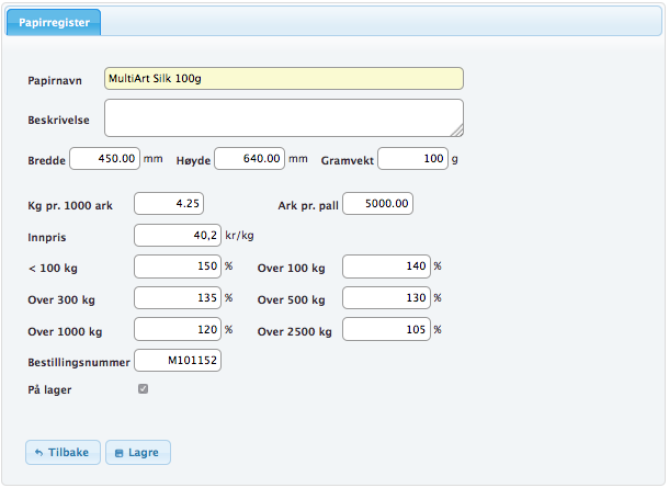 Et papir har en bredde, høyde og en gramvekt i tillegg til innpris. Innpris oppgis som kilopris.