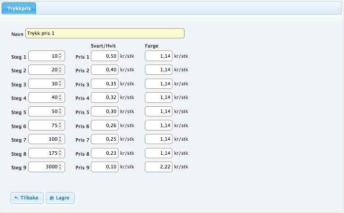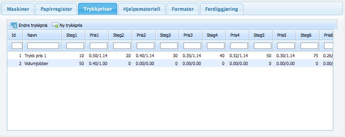 Trykkpriser sier noe om hvor mye det koster å trykke på én trykkark-side som går gjennom maskinen, og basert på det totale omfang sider som skal trykkes brukes prisen fra de ulike stegene som kan settes opp. Dersom det er én flat trykkpris, holder det å fylle ut ett steg.