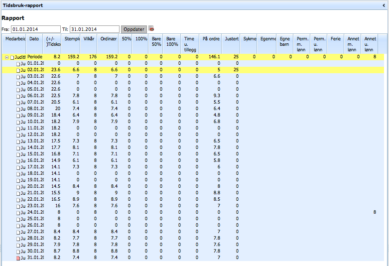 Velg datoomfang og klikk «Oppdater» for å se andre dager enn inneværende måned. Avhengig av størrelsen på datoomfanget, og om du har tilgang til andres tidsregistreringer, kan oppdateringen av tabellen ta litt tid.