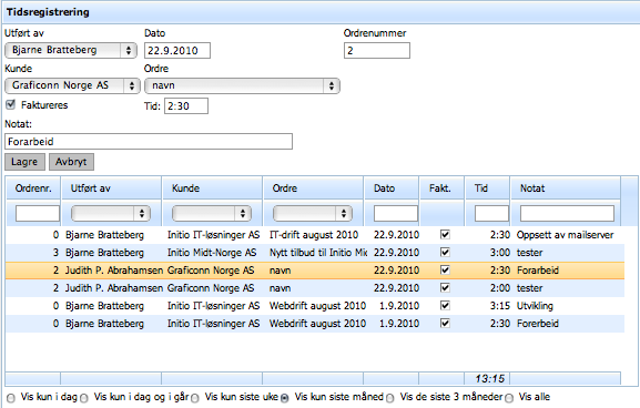 Som standard viser tabellen all tid registrert på alle ansatte siste måned. Tabellen kan sorteres og filtreres på vanlig måte. I tillegg er det definert noen standardfiltreringer som er tilgjengelig under tabellen. Disse er:
