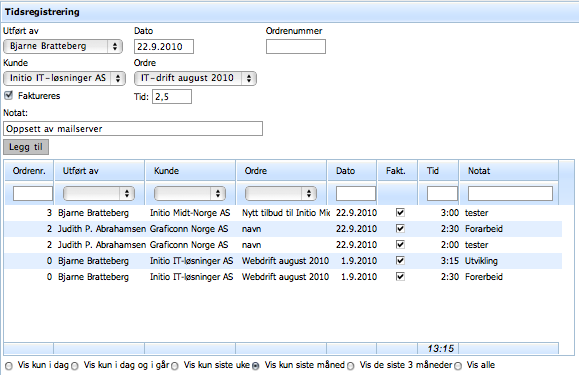 Alle brukere som er opprettet under systemeier-firmaet kan benytte tidsregistrering. Tiden som registreres må registreres på en kunde og ordre. Det er ikke mulig å registrere tid på tilbud. Det er heller ikke mulig å registrere tid på kansellerte eller fakturerte ordrer.