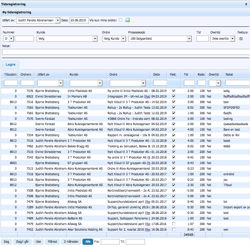 - Alle – viser absolutt alle tidsregistreringer, og kan ta tid å laste inn.